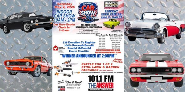 Join us on May 2 from 10:00AM-2:00PM for the annual Bumper to Bumper Car Show at the Conway Expo Center! Dave Elswick will be doing a special on site broadcast of "Bumper to Bumper Car and Truck Doctors Show" starting at 7:00AM